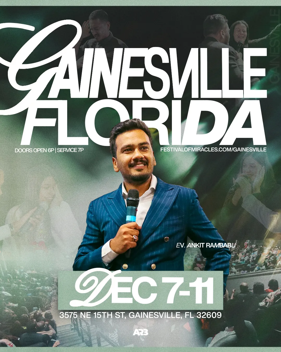We would like to officially announce that Festival of Miracles is coming to Gainesville, a 5-night Holy Ghost revival from December 7 - 11, 2025!