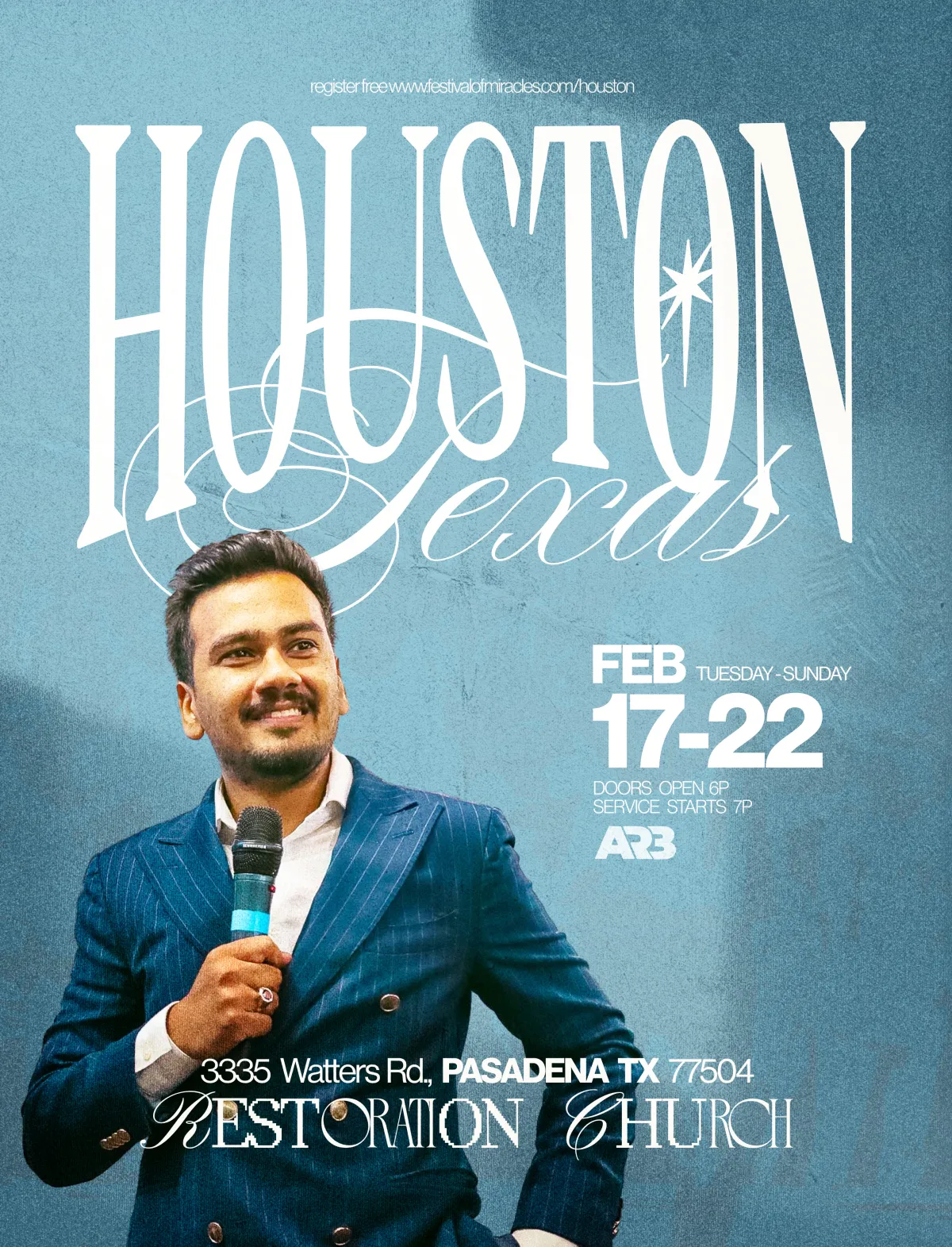 From February 17-22, we will be in Houston, TX for Festival of Miracles. It will be 6 nights of miracles, signs, and wonders. You will not leave the same, get there, and don't miss this. We look forward to seeing you, on February 17. Doors open at 6 PM and service starts at 7 PM.